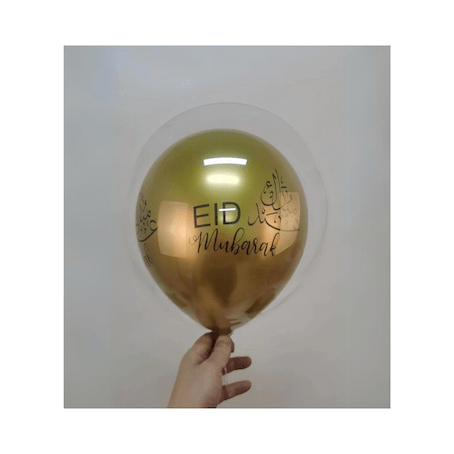 Un lot est composé d’un ballon transparent et d’un ballon doré estampillé Eid Mubarak
