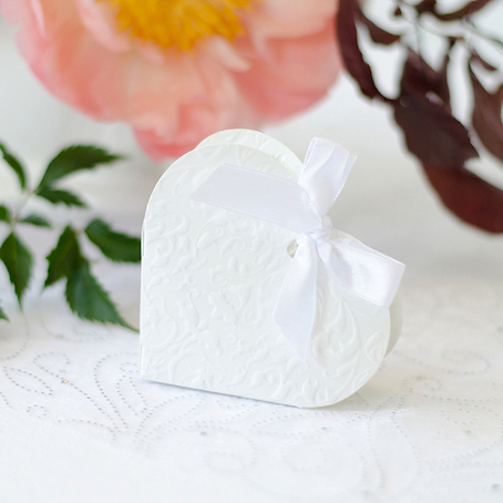 Boîtes en forme de cœur en papier blanc, parfaites pour les cadeaux de vos invités, dimensions après pliage 10x9x3 centimètres.