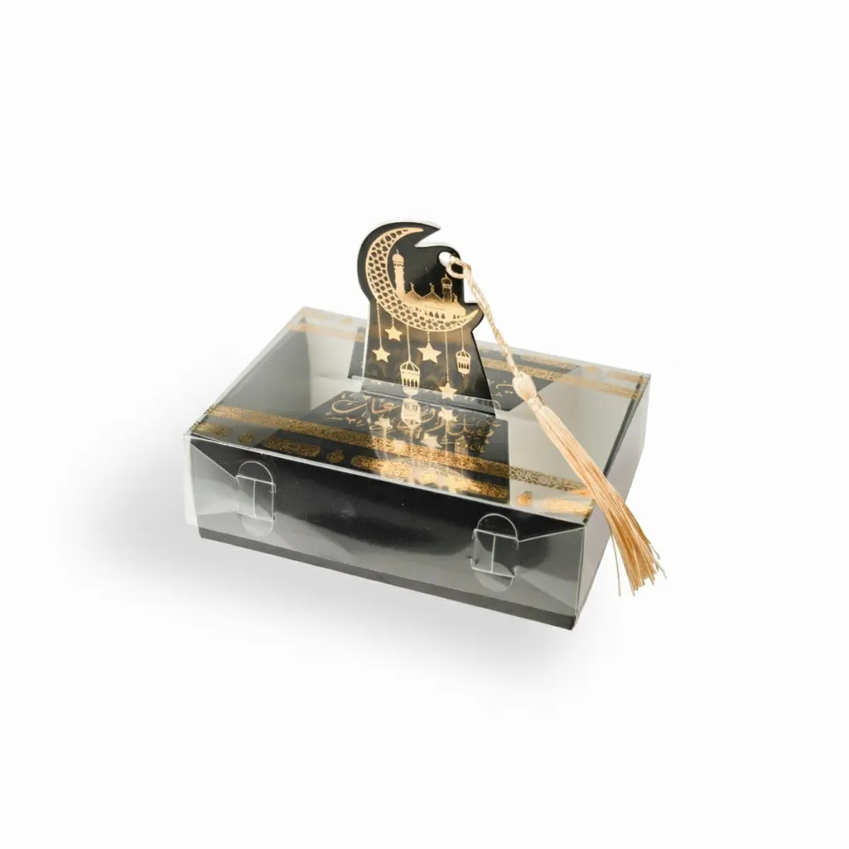 Boîte cadeau transparente thème Omra avec décor doré, idéale pour gâteaux, dattes et petits cadeaux de retour de pèlerinage.