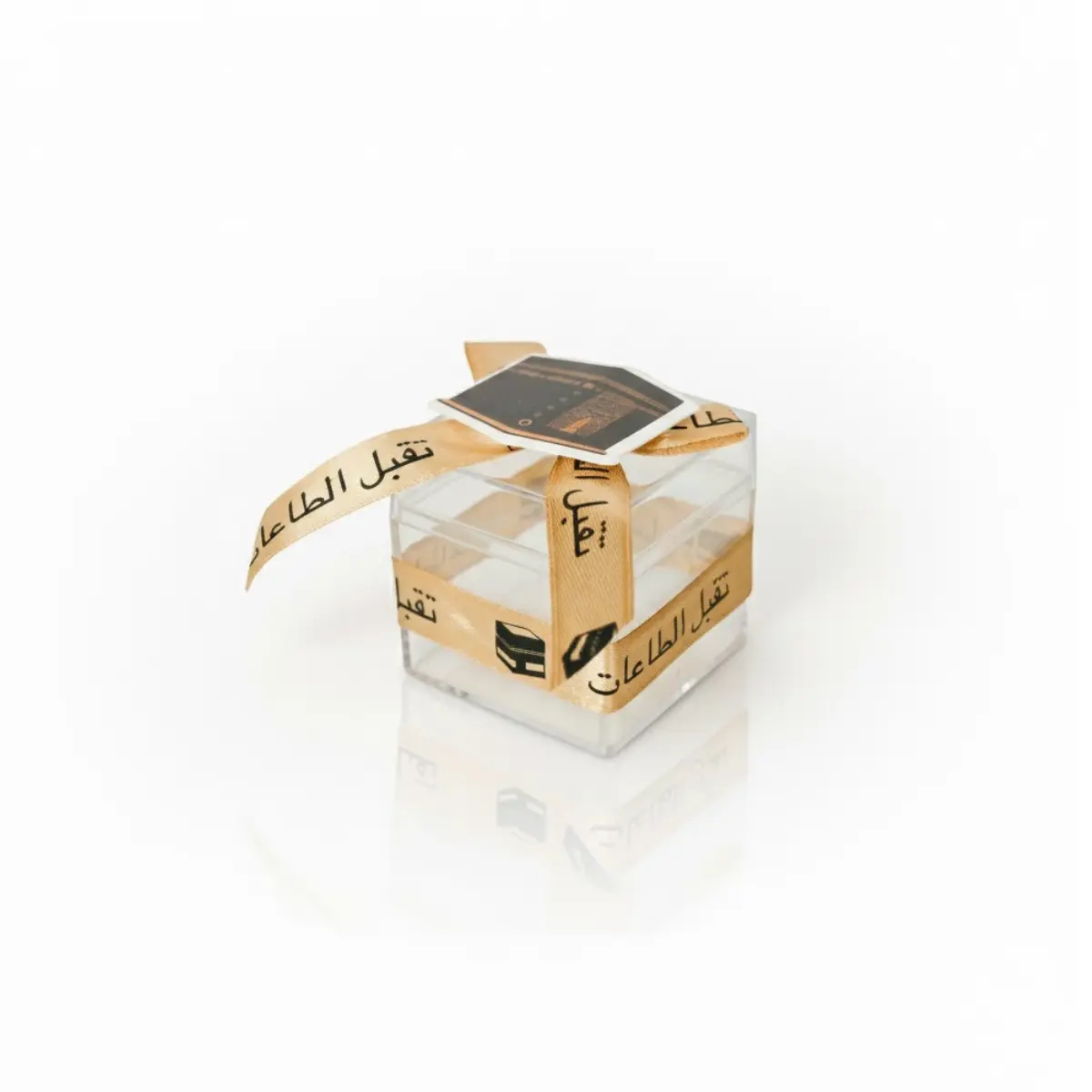 Boîte cadeau Omra Hajj transparente avec décor, idéale pour gâteaux, dattes et petits cadeaux de retour de pèlerinage.