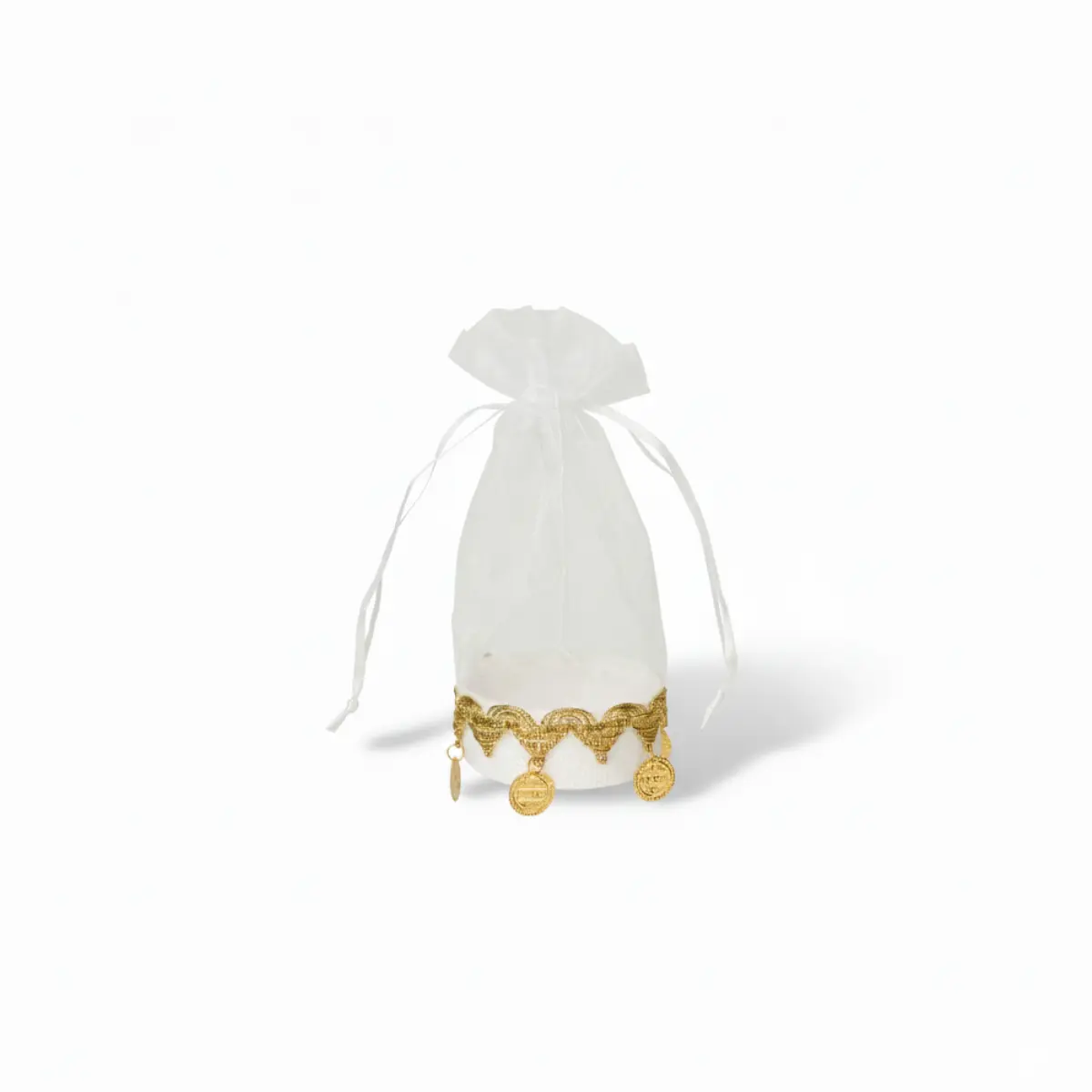 La bonbonnière Kasbah incarne l’élégance des traditions et le raffinement des grandes célébrations. Conçue en tulle blanc délicat, elle est sublimée par de breloques dorées au style traditionnel, rappelant l’ornementation des cérémonies orientales.