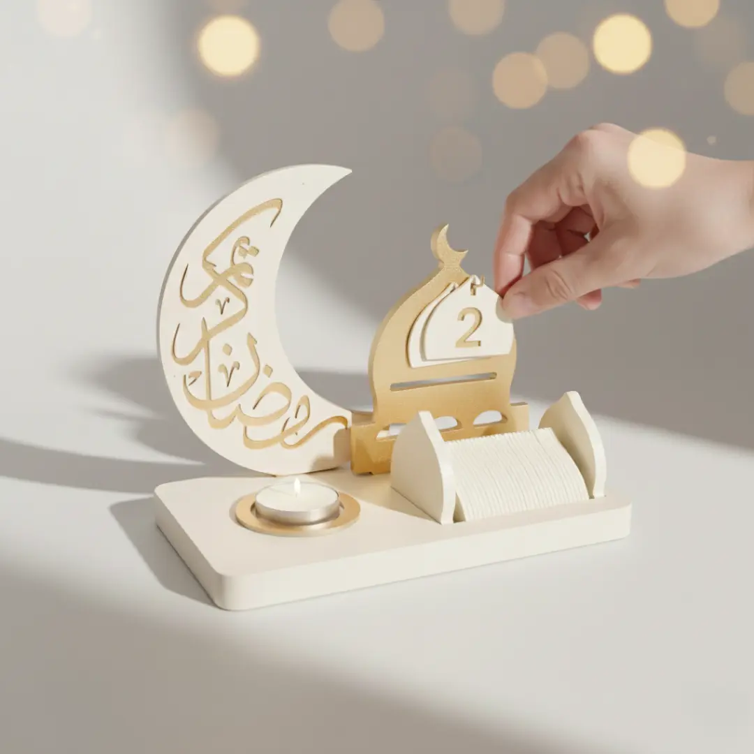 Associez le calendrier Hilal à une lanterne lumineuse ou une guirlande LED pour créer un coin Ramadan chaleureux et spirituel. Placez-y une bougie parfumée pour accompagner les soirées du mois sacré.