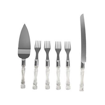 Ensemble de couteau à gâteau, pelle et 4 fourchettes. Jolis manches transparents