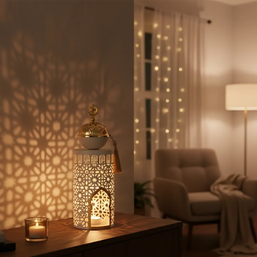Associez cette lanterne mabkhara à des lanternes Manar ou Hilal pour créer une décoration Ramadan complète : lumière, parfum et spiritualité réunis dans un même univers.