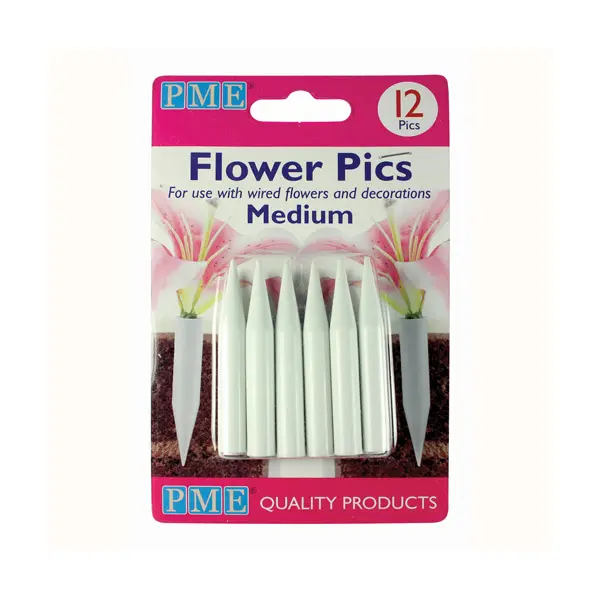 Remplissez ces pics PME d’eau, piquez-les dans un gâteau ou un cake puis placez-y une fleur. Ces pics pour fleurs permettent également d’utiliser – en toute sécurité pour vos gâteaux – des fleurs artificielles avec une tige de métal.