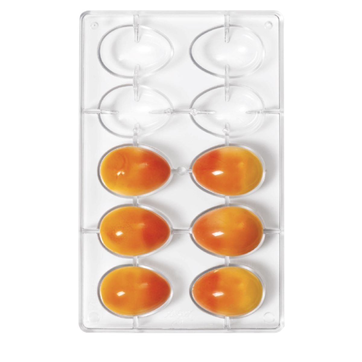 Ce moule est idéal pour former des œufs en chocolat.  Sa qualité permet de rendre un aspect brillant au chocolat. Il suffit d’assembler deux coques en chocolat pour obtenir une forme parfaite d’œuf en 3D.