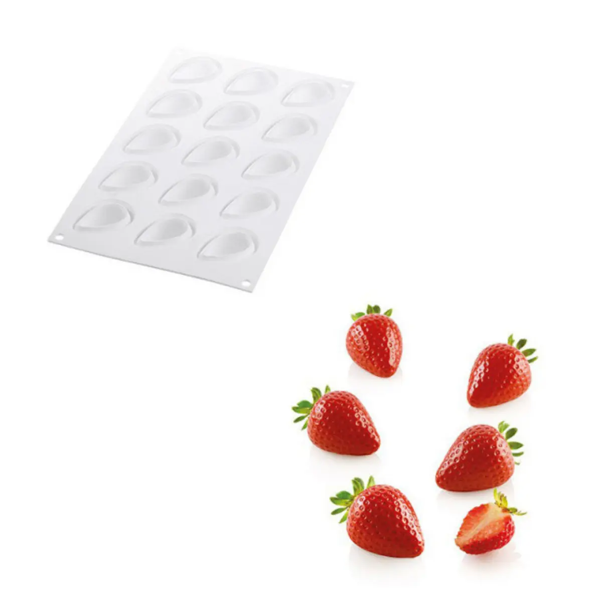 La fraise, ce fruit rouge et gourmand, évoque les beaux jours et les desserts frais. Avec le moule silicone 15 mini fraises, créez des trompe-l’oeil surprenants et délicieux : entremets, mousses ou gâteaux individuels, laissez parler votre créativité.