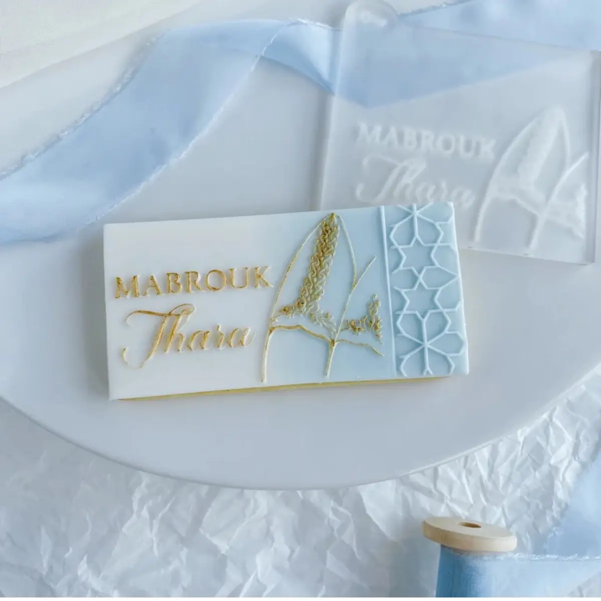 Il suffit d’étaler de la pâte à sucre sur le tampon afin de créer un design en 3D. Vous pouvez ensuite peindre ou non les décorations en 3D.