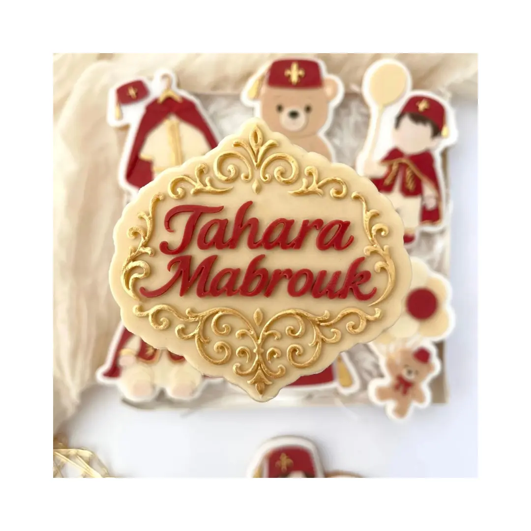 Donnez une touche unique à vos créations avec cet embosseur pâtisserie Tahara Mabrouk et son découpoir, spécialement imaginé pour accompagner les célébrations de circoncision. Avec ce message de félicitations, personnalisez facilement vos biscuits, sablés ou décorations en pâte à sucre.