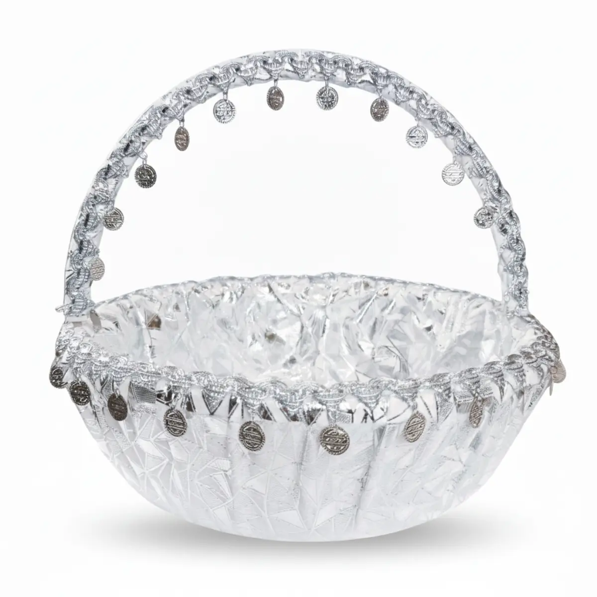 Offrez à vos invités une présentation soignée et raffinée avec ce panier décoratif argenté. Idéal pour tous vos mariages, henné, circoncision et événements traditionnels, il est prêt à embellir votre journée spéciale.