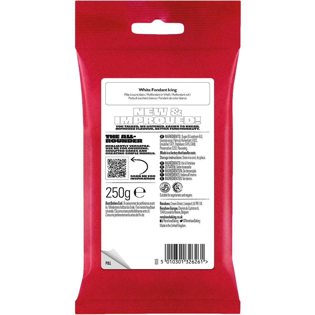 Cette pâte à sucre blanche de Renshaw peut être étalée, modelée, façonnée avec des emporte-pièces ou des moules. Elle est parfaite pour recouvrir et décorer des gâteaux, cupcakes et biscuits. Idéal pour toutes vos créations, qu’il s’agisse de gâteaux pour un mariage ou d’autres occasions festives, ou pour vous amuser avec vos enfants ! Cette pâte à sucre roulée prête à l’emploi est facile à utiliser.