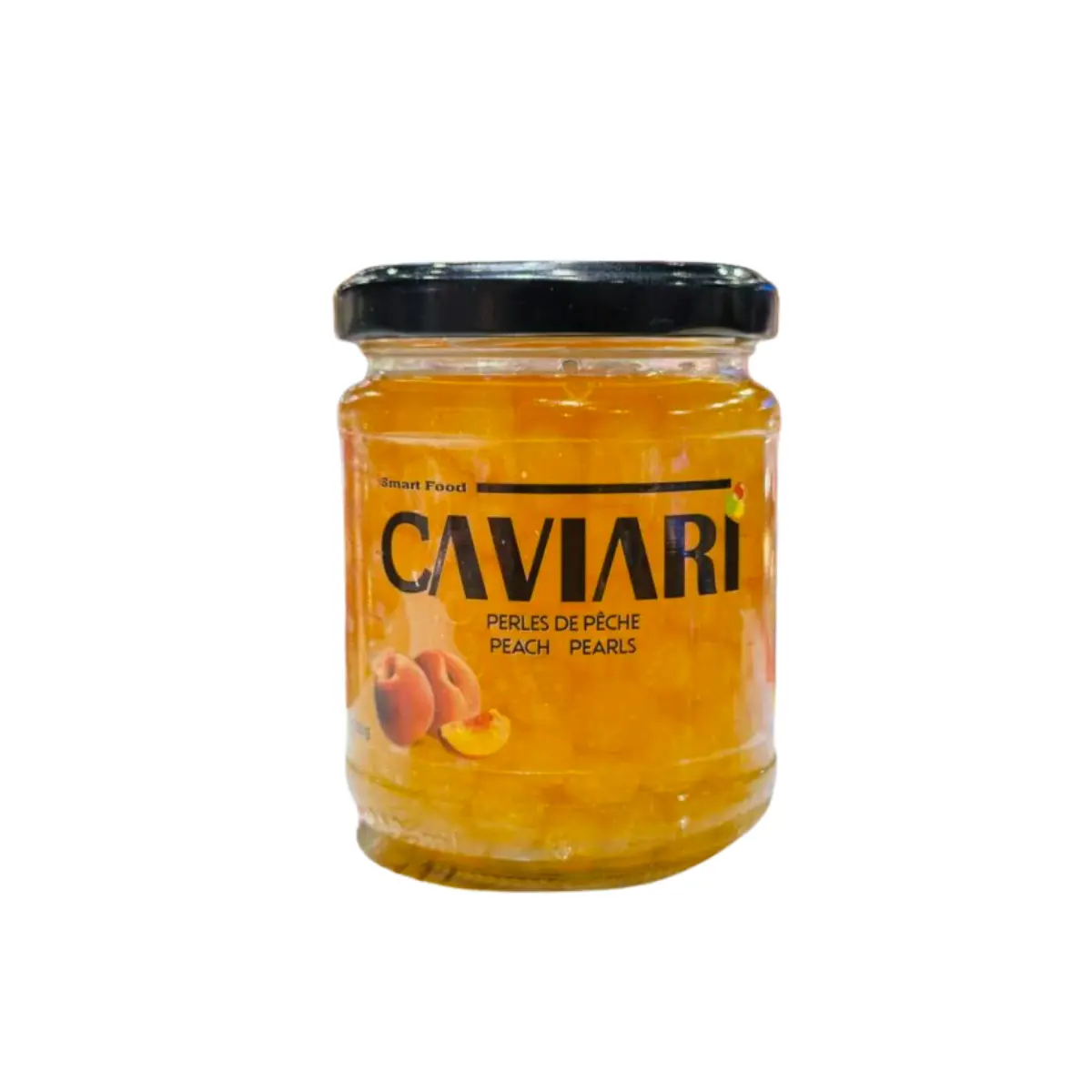 Ingrédients :Perles de fruits en gelée, purée de pêche, eau, sirop de glucose, arôme, stabilisant, lactate de calcium, épaississant, gomme xanthane, alginate de sodium, acidifiant, acide citrique.