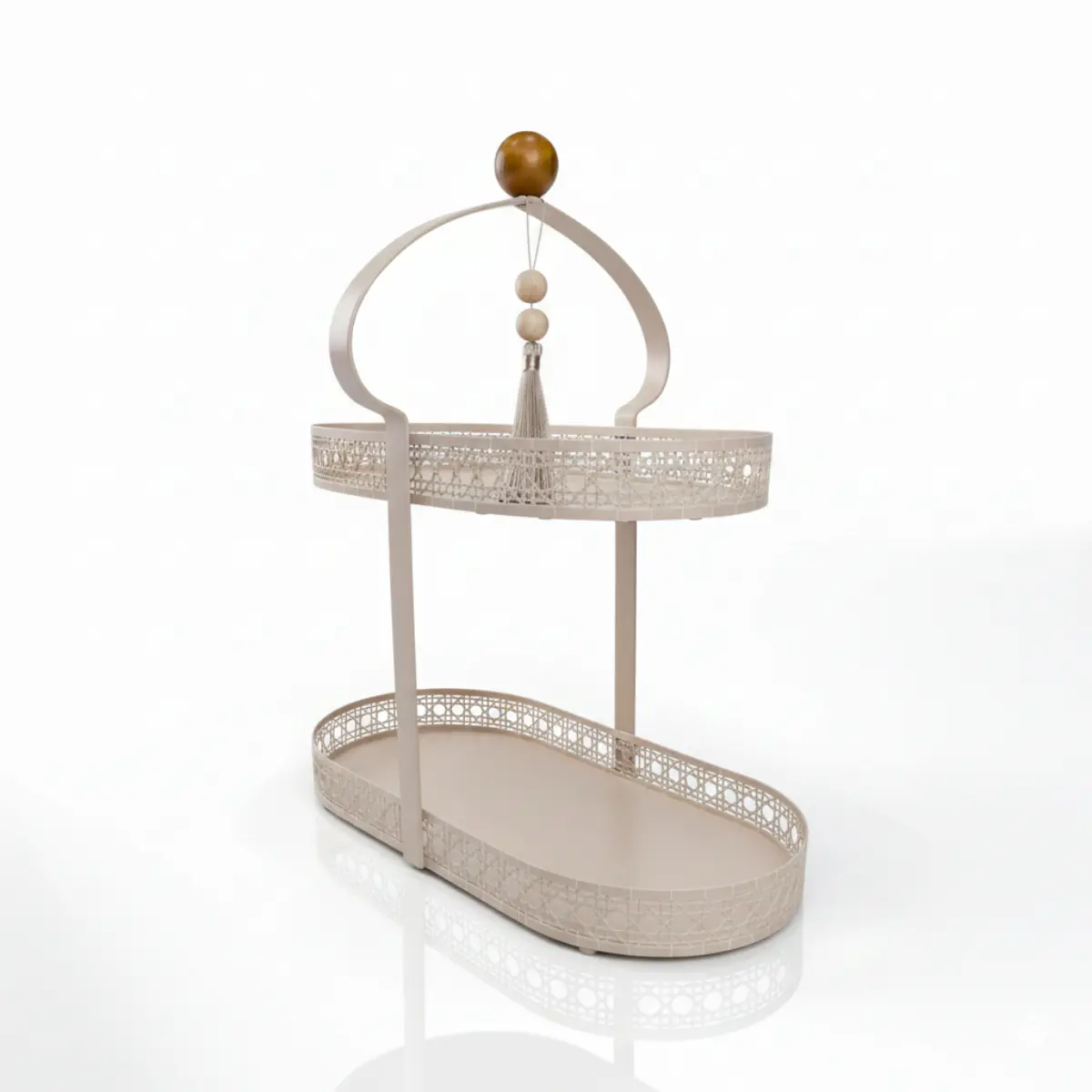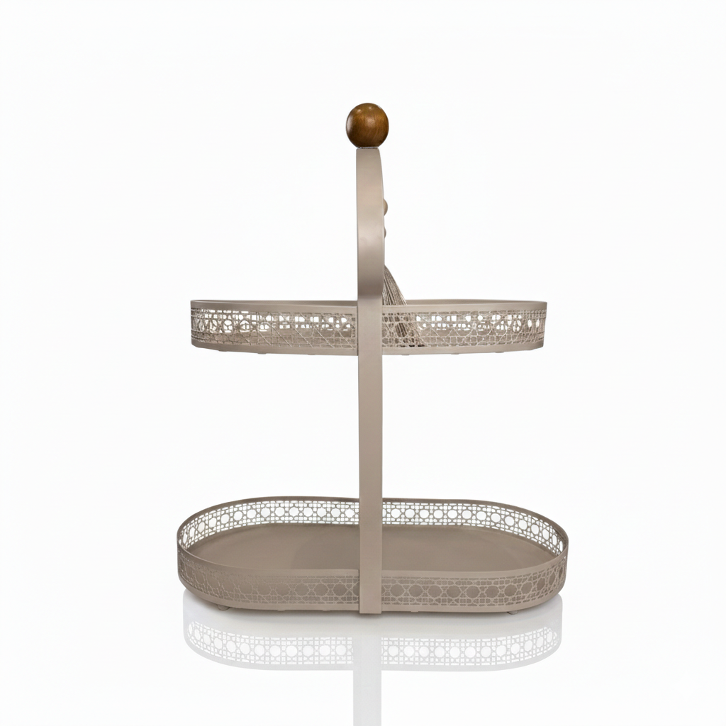 Grâce à ses deux plateaux ovales superposés, ce plat permet de présenter pâtisseries, fruits ou objets décoratifs avec équilibre et légèreté. La hauteur apporte du rythme à votre décoration tout en conservant une esthétique aérienne.