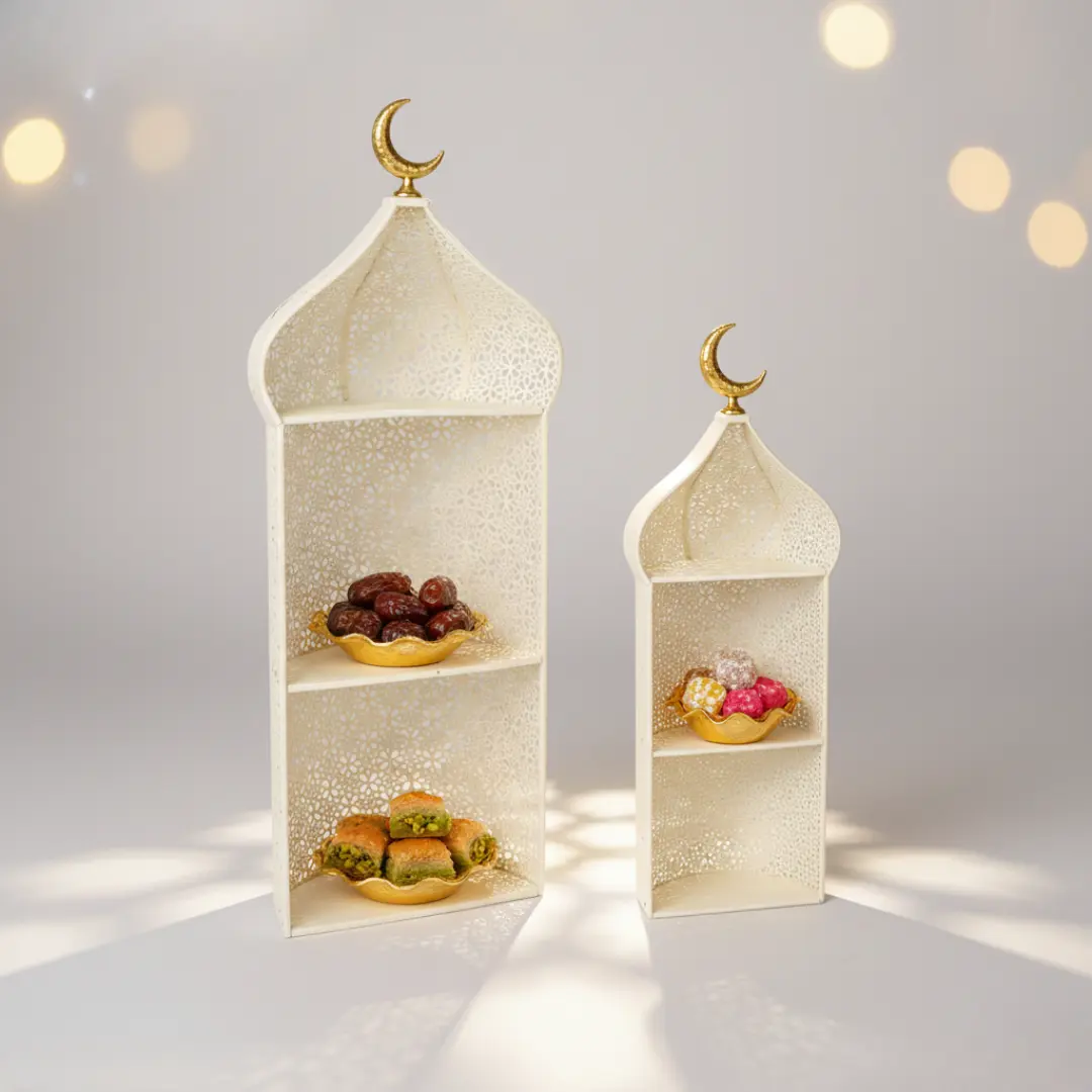 Associez les deux présentoirs Qafas crème à des éléments dorés ou naturels pour une ambiance élégante et chaleureuse. Parfait en duo sur un buffet ou de part et d’autre d’une table pour structurer l’espace avec raffinement.