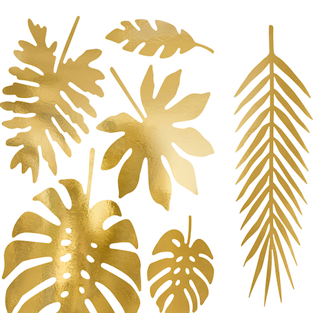 Décorations en papier Aloha – Feuilles tropicale sde couleur or métallique, jeu comprenant 7 formes (3 de chaque).