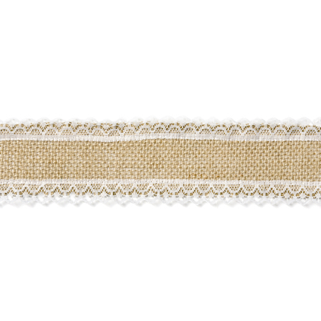 Ruban de jute avec dentelle blanche, largeur d’environ 5 cm, longueur d’environ 5 m.