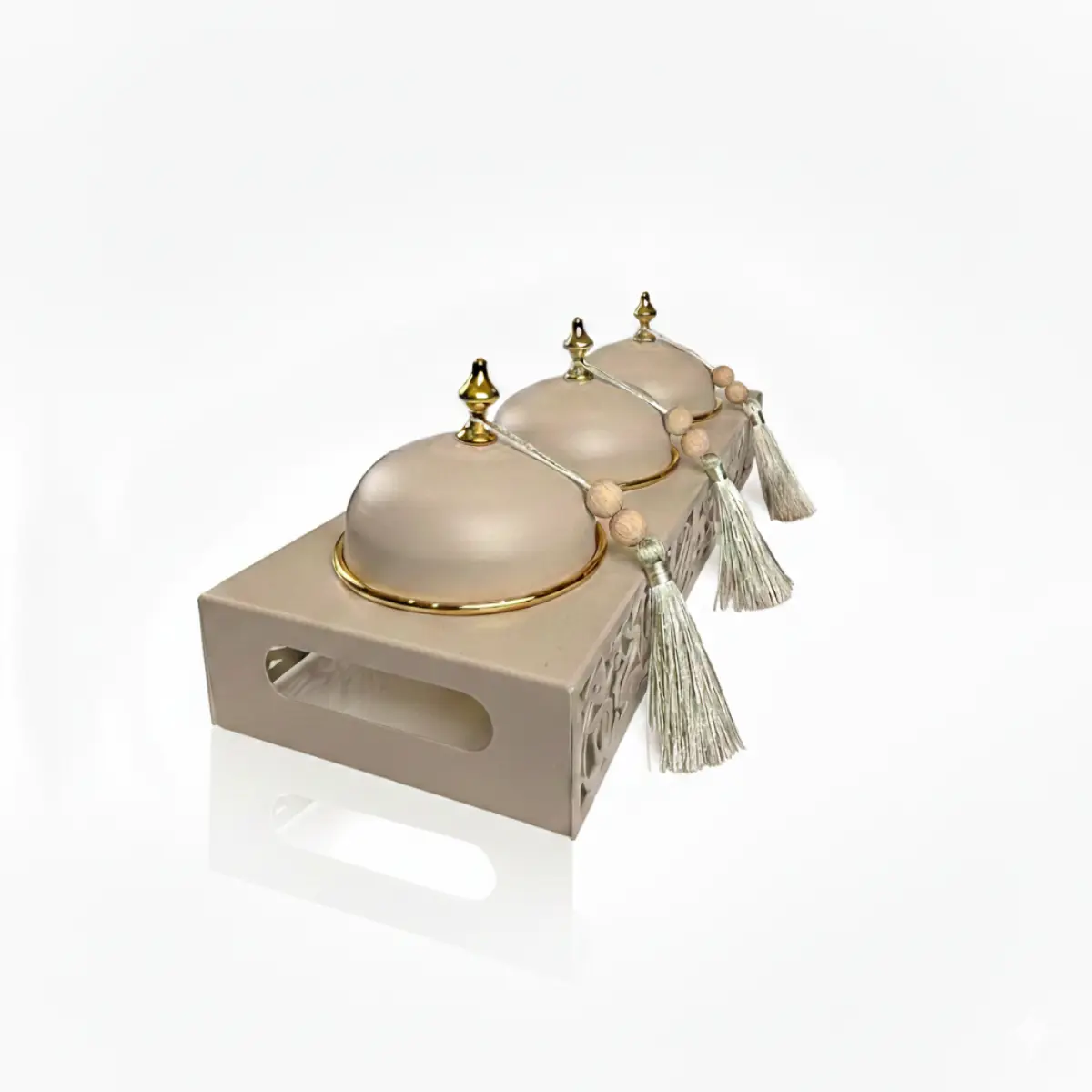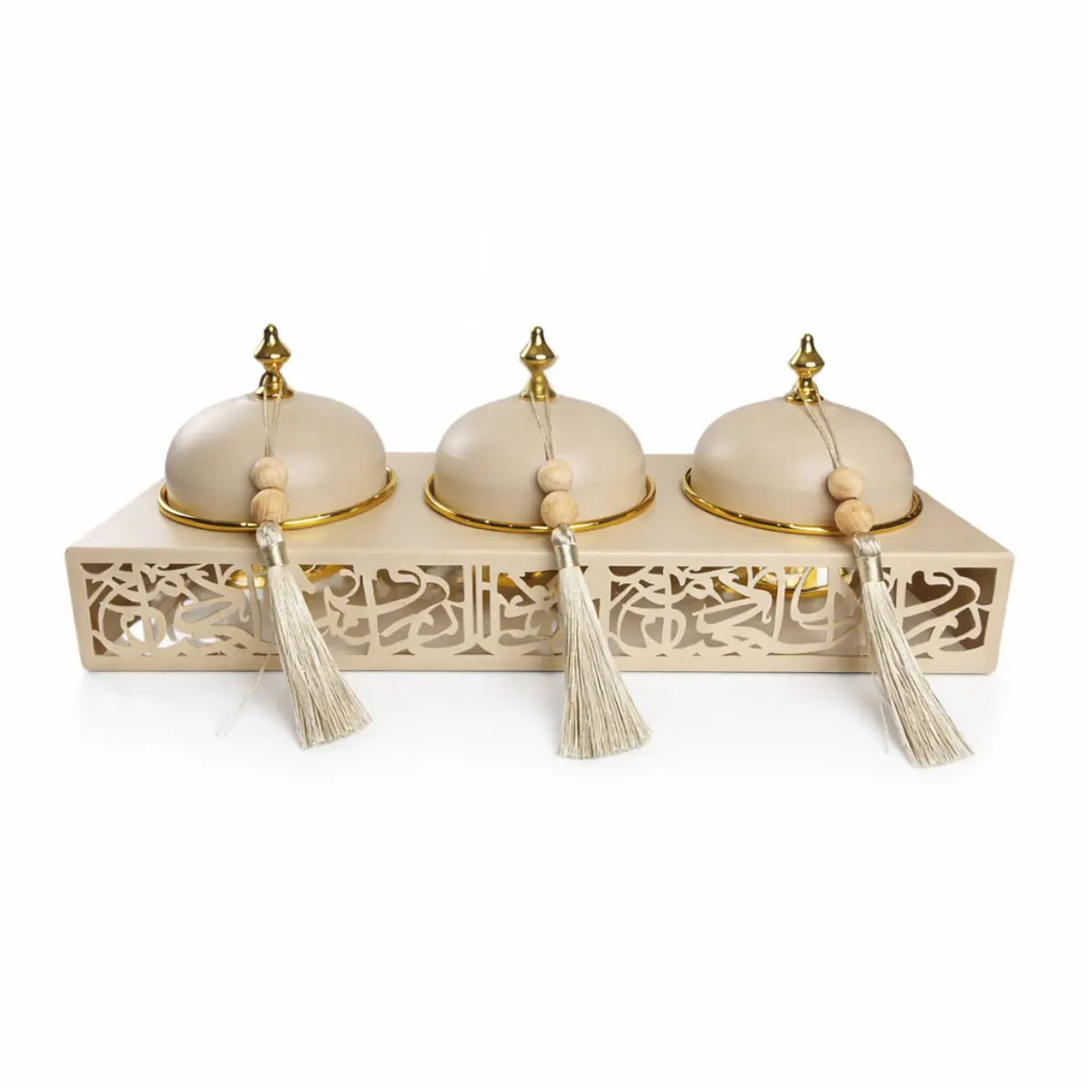 Composé de trois contenants sous cloche, il est pensé pour servir vos invités avec élégance, en mettant en valeur dattes, douceurs, fruits secs ou mignardises lors de vos réceptions.