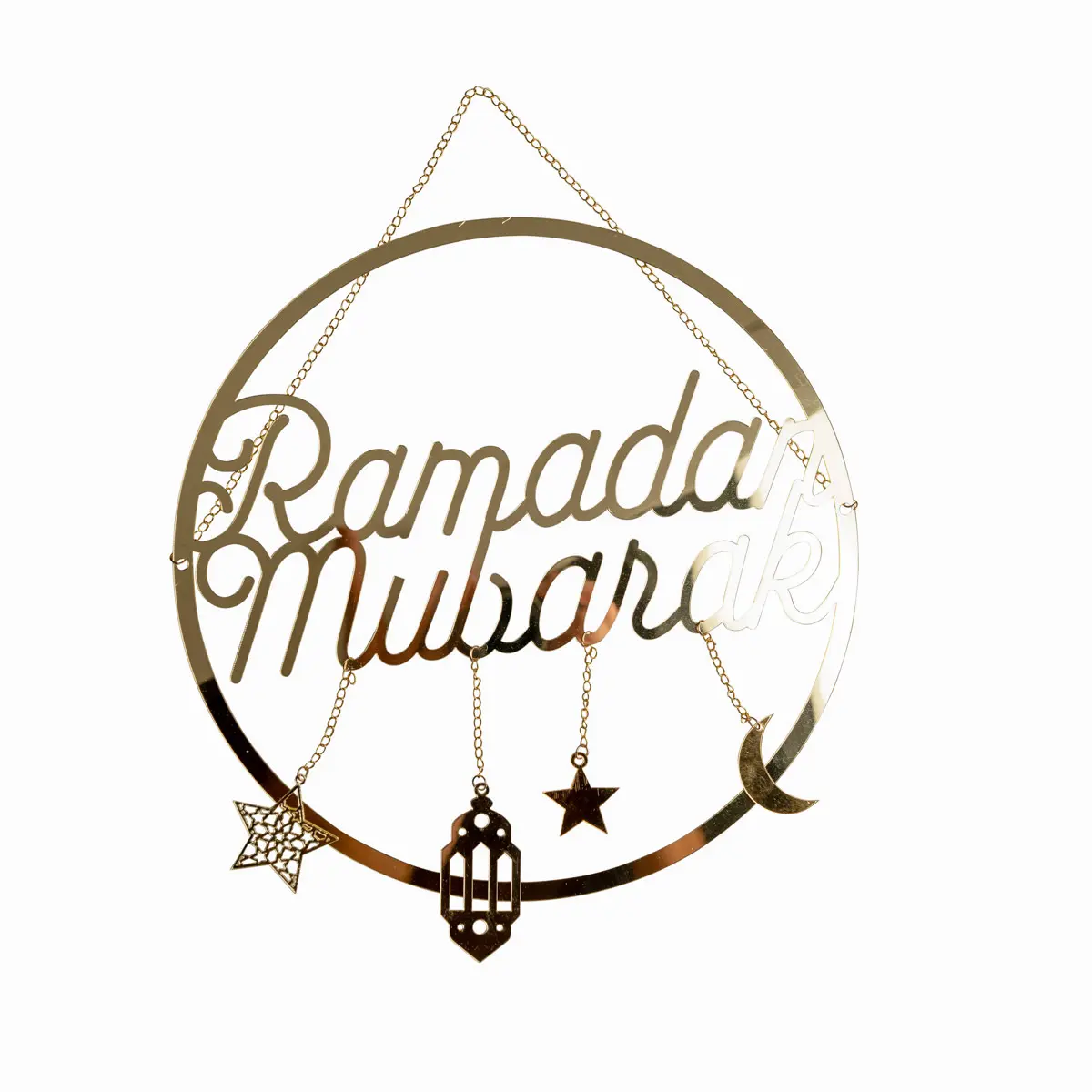 Ajoutez une touche de raffinement à votre intérieur avec cette magnifique suspension ronde en acrylique doré « Ramadan Mubarak ».