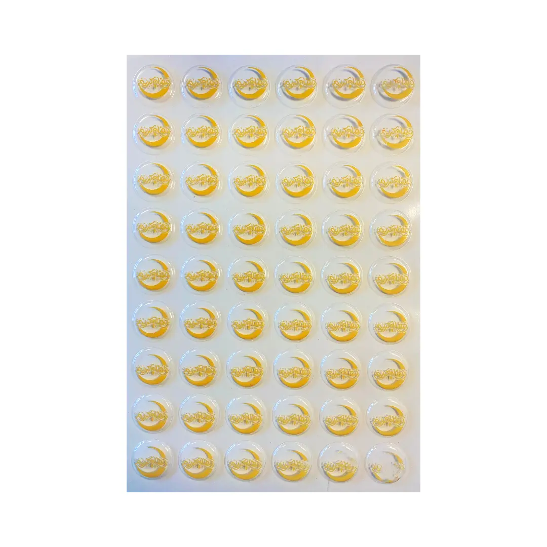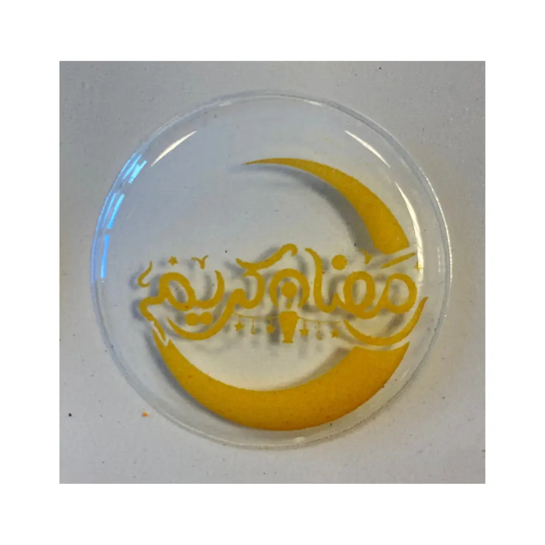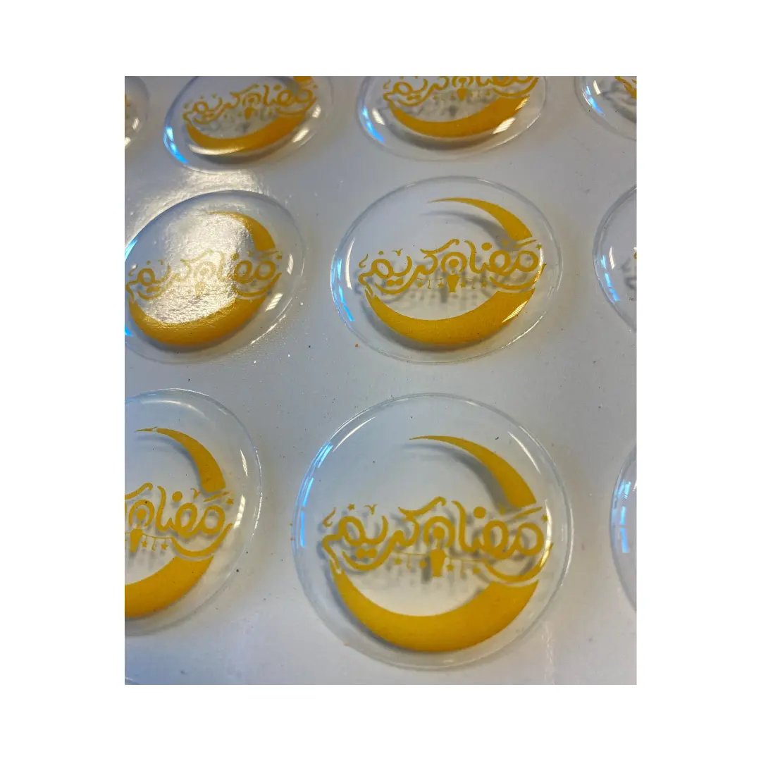 Les empreintes de transfert chocolat Ramadan Kareem en calligraphie au ton jaune orangé sont des feuilles PVC recouvertes d’une fine couche de beurre de cacao.