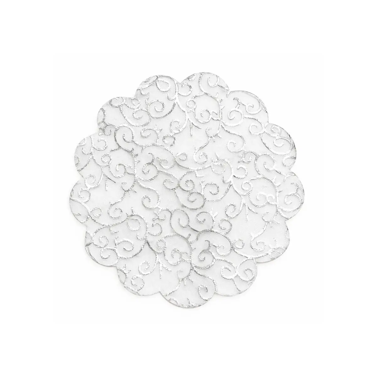 Ce tulle décoratif brodé argent est spécialement destiné à la pâtisserie orientale, pour apporter une touche finale soignée et raffinée aux gâteaux traditionnels. Sa broderie dorée aux motifs arabesques habille parfaitement la présentation et met en valeur le dessert sans en détourner l’attention.
