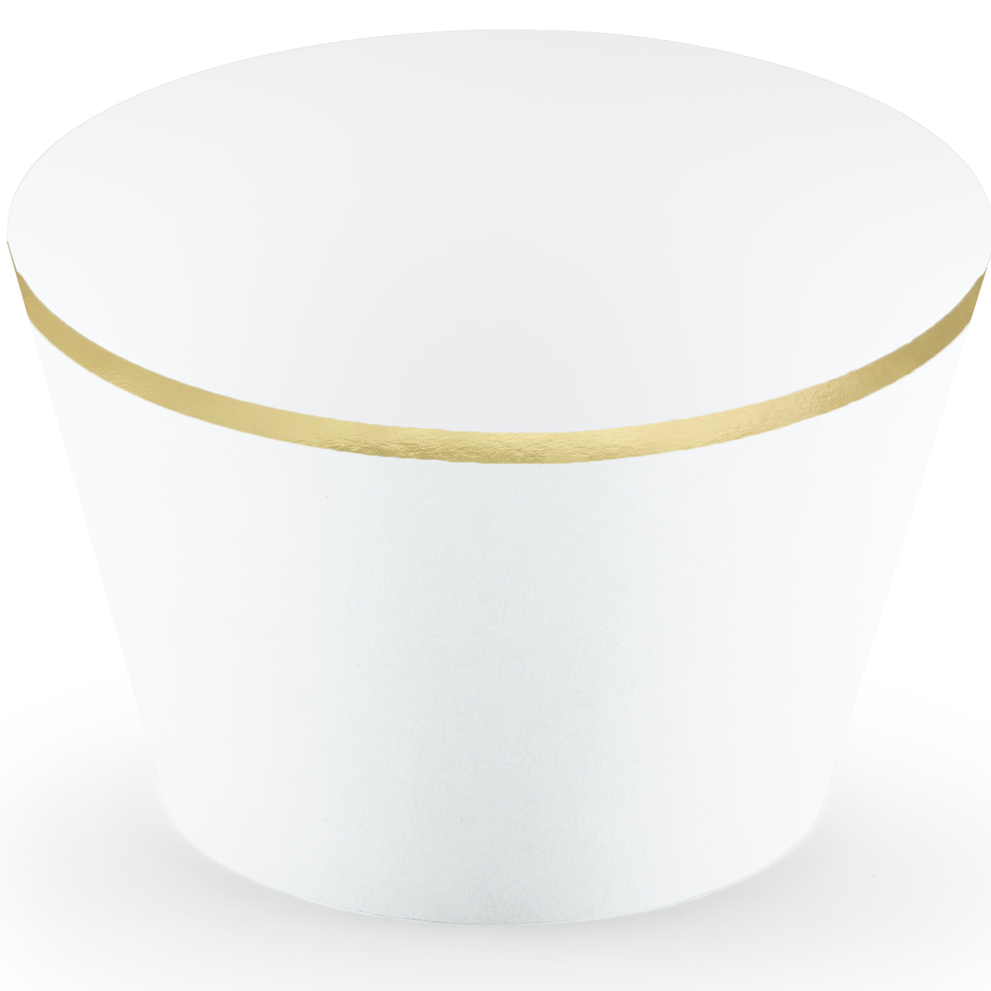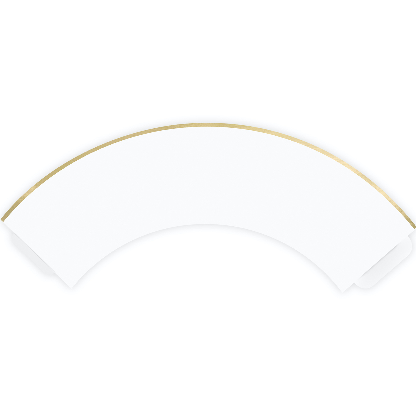 Décorations de gâteaux Elegant Bliss en blanc avec bords métallisés dorés, dimensions après pliage environ 4,8 x 7,6 x 4,6 cm.