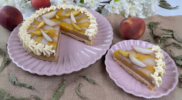 Une tarte élégante et rafraîchissante : fond de pâte sucrée croustillante, crème diplomate parfumée à la verveine, et gelée de pêches fondante.