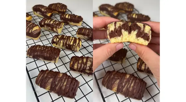 Dans la première moitié, ajoutez le cacao.Dans la seconde, ajoutez l’arôme vanille.Versez les pâtes en alternant chocolat / vanille dans les cavités du moule en silicone 12 rectangles pour créer un bel effet marbré.Enfournez 15 à 20 minutes à 180 °C, jusqu’à ce que les biscuits soient légèrement dorés.À la sortie du four, laissez tiédir puis ajoutez un filet de chocolat fondu à l’aide d’une poche à douille pour encore plus de gourmandise.