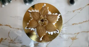 Garnir la pavlova de crème chocolat mascarpone ; utiliser une poche et une jolie douille pour un effet élégantDisposer les poires queue vers l'extérieur en écartant légèrement les lamelles.Et au centre, disposer les petits morceaux de poiresAjouter la décoration de votre choix, idéalement un rappel de chocolat avec les boules crispies et un flocon de feuille d'or.